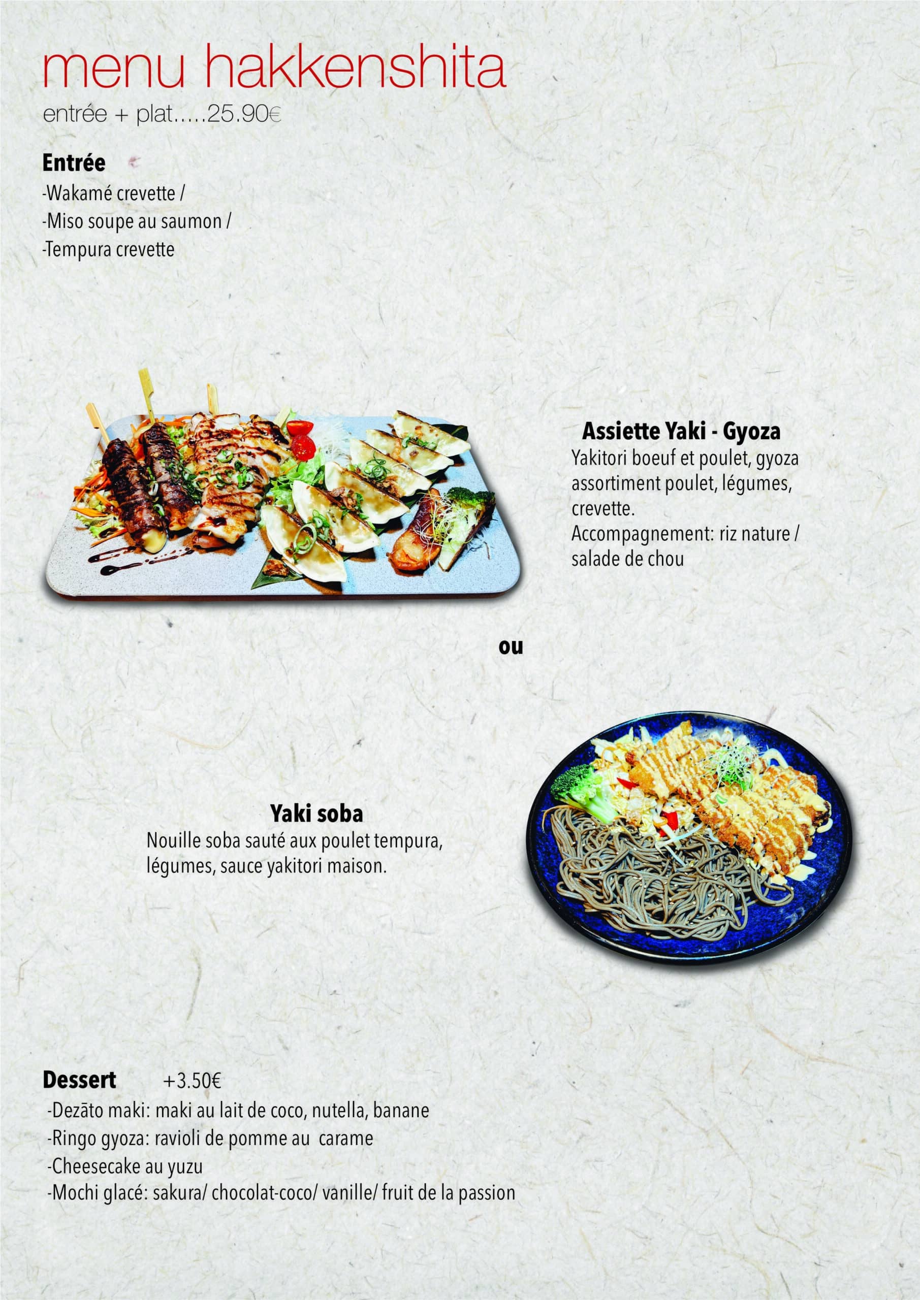 Un délicieux menu comprenant une entrée au choix parmi Wakame crevette, soupe miso au saumon ou tempura crevette, accompagné de plats comme l’assiette Yaki-Gyoza ou des nouilles soba sautées. Dessert inclus avec options sucrées à choisir